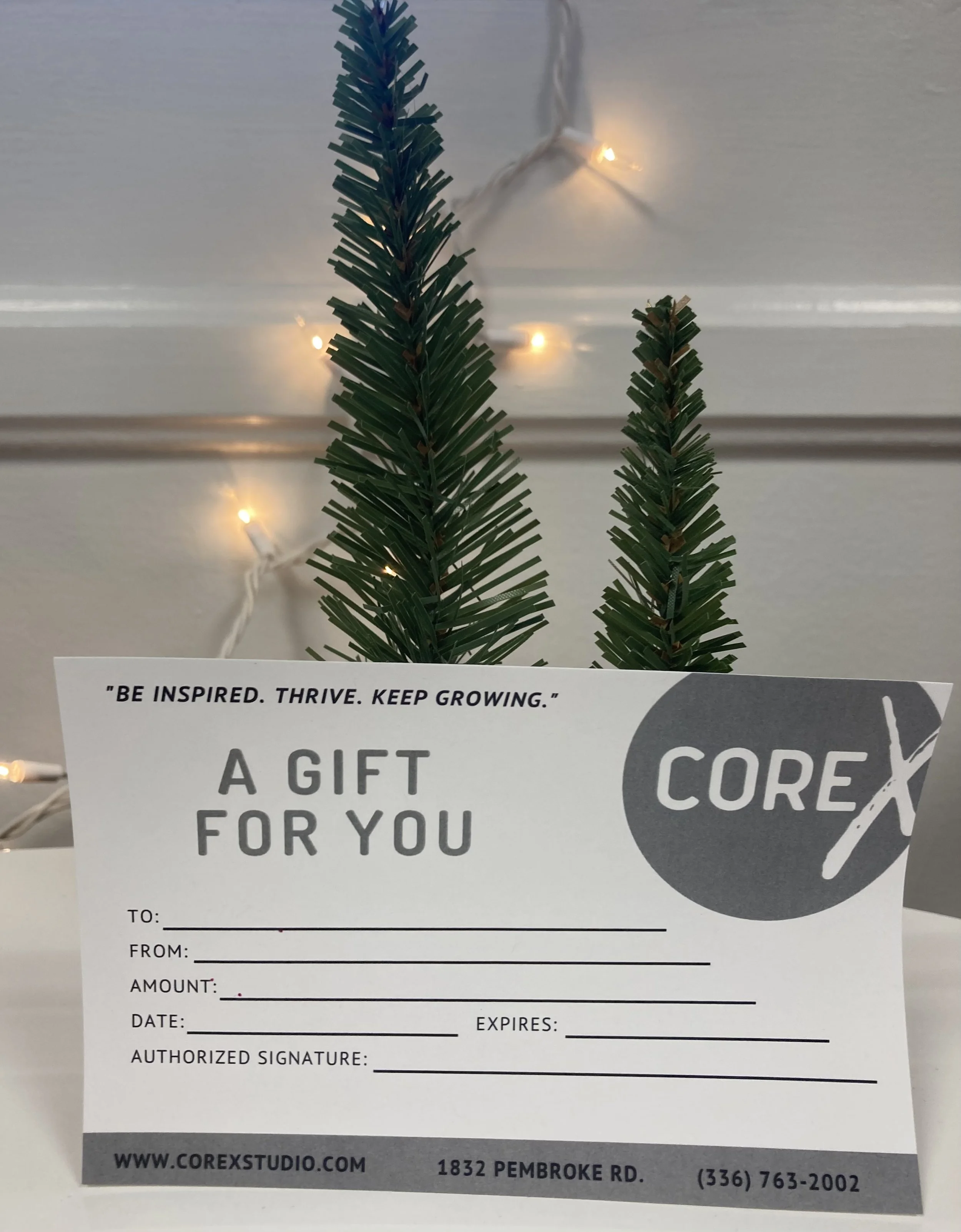 Gift cards can be purchased at the studio, by email at contact@corexstudio.com, or by phone at 336-312-8871